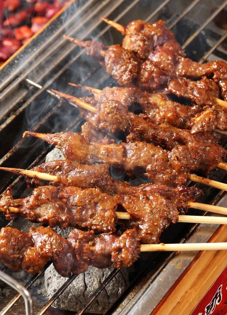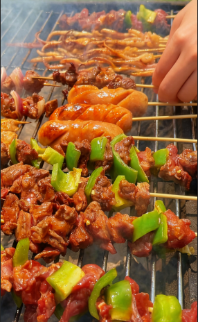 羊肉串、肥牛串、烤肠在炭火炙烤中滋滋作响,焦香肉质裹挟香料,瞬间引爆味蕾