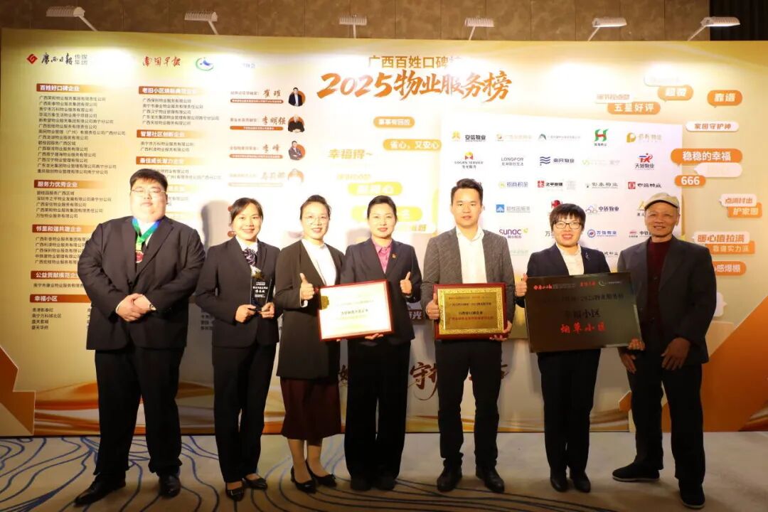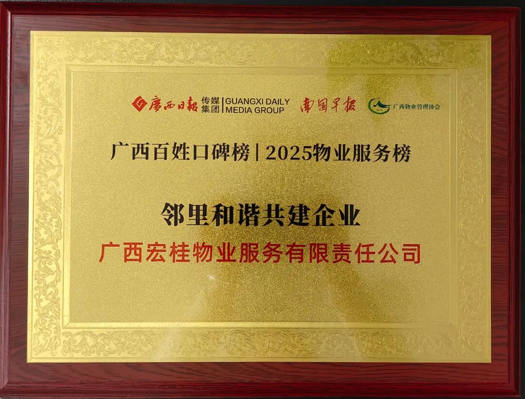 广西百姓口碑榜——2025物业服务榜颁奖盛典由自治区住房和城乡建设厅指导,广西日报传媒集团主办,南国早报、广西物业管理协会共同承办。本次活动通过线上网络投票与线下专家评审相结合的方式开展,经专家评审团严格细致的走访评审,宏桂物业公司凭借其优秀的服务品质和良好的品牌形象,在众多参评的物业服务企业中脱颖而出,分别荣获“百姓好口碑企业、邻里和谐共建企业”2个企业奖项,公司在管的烟草小区荣获“幸福小区”荣誉称号,公司项目主管廖长姣荣获“解决问题先锋”荣誉称号。