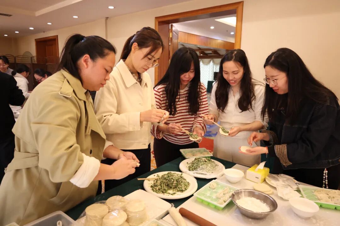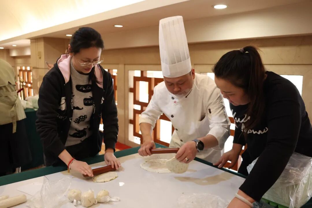 活动现场暖意融融、烟火气十足。明园饭店专业烹饪老师首先示范讲解了饺子擀皮手法、捏合技巧,以及烙饼厚薄把控、火候掌握等关键要点。一张张薄厚均匀的烙饼、一盘盘形态饱满的饺子,不仅承载着传统饮食文化的韵味,更凝聚了女职工们的协作与热情。制作完成后,大家围坐一堂品尝亲手制作的美食与精心搭配的茶点,分享品鉴、交流感受,在欢声笑语中增进了情谊。