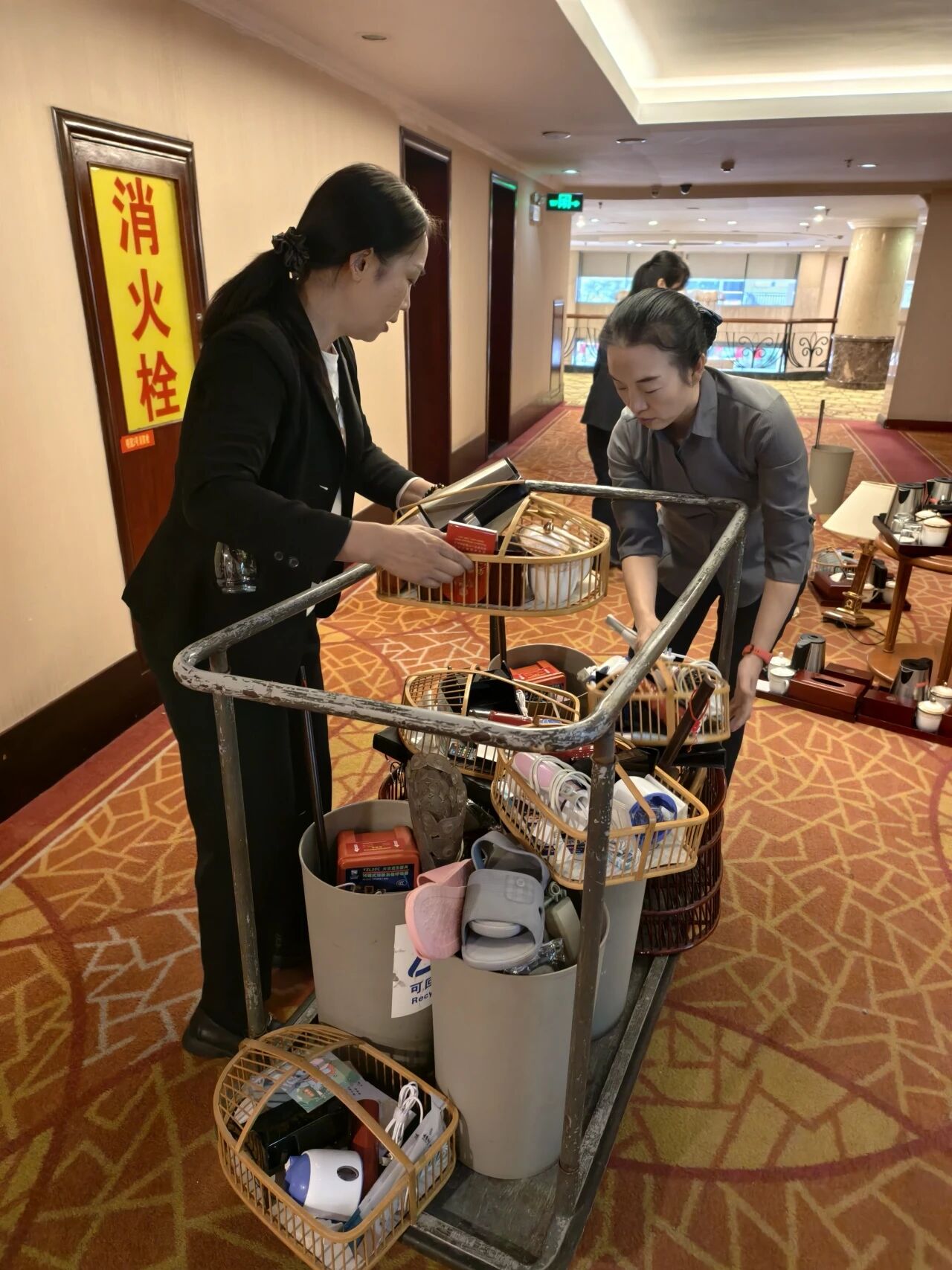 展会落幕之后,清理复原工作迅速启动。全体参与员工第一时间将客房内床垫、各类物品恢复原位,手持清洁工具对家具、窗台、墙角等细节部位进行细致擦拭,并严格落实消杀通风措施,全力还原洁净舒适的住宿环境。从物资转运到卫生清扫,各环节衔接紧密、运转顺畅,充分展现了饭店员工过硬的执行能力和良好的协作精神。